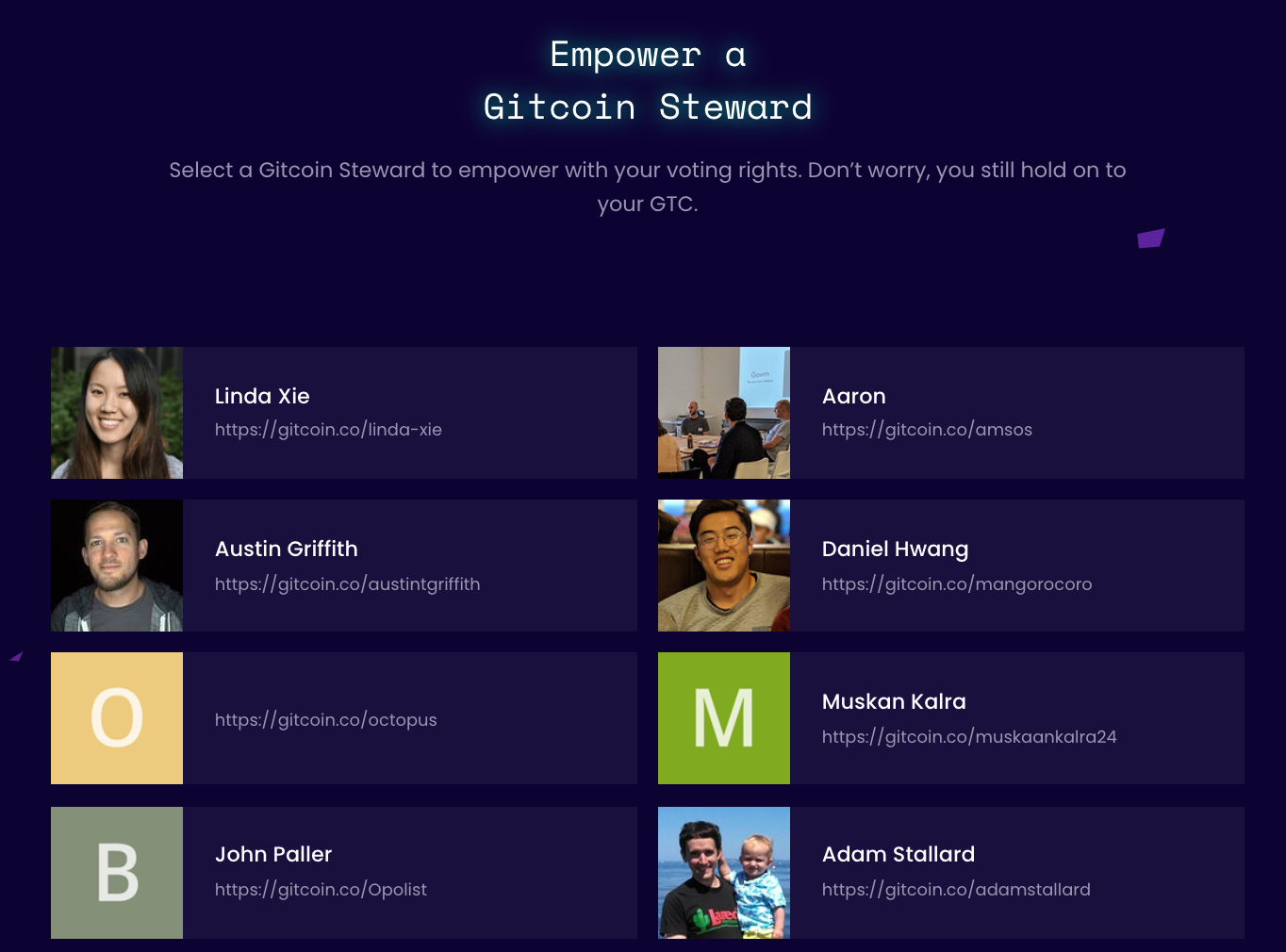 Once youâve completed Proof of Knowledge, youâre ready to move onto Proof of Use. Here, youâll be asked to delegate your GTC to one of the Gitcoin Stewards or asked to vote on your own! Itâs up to you.