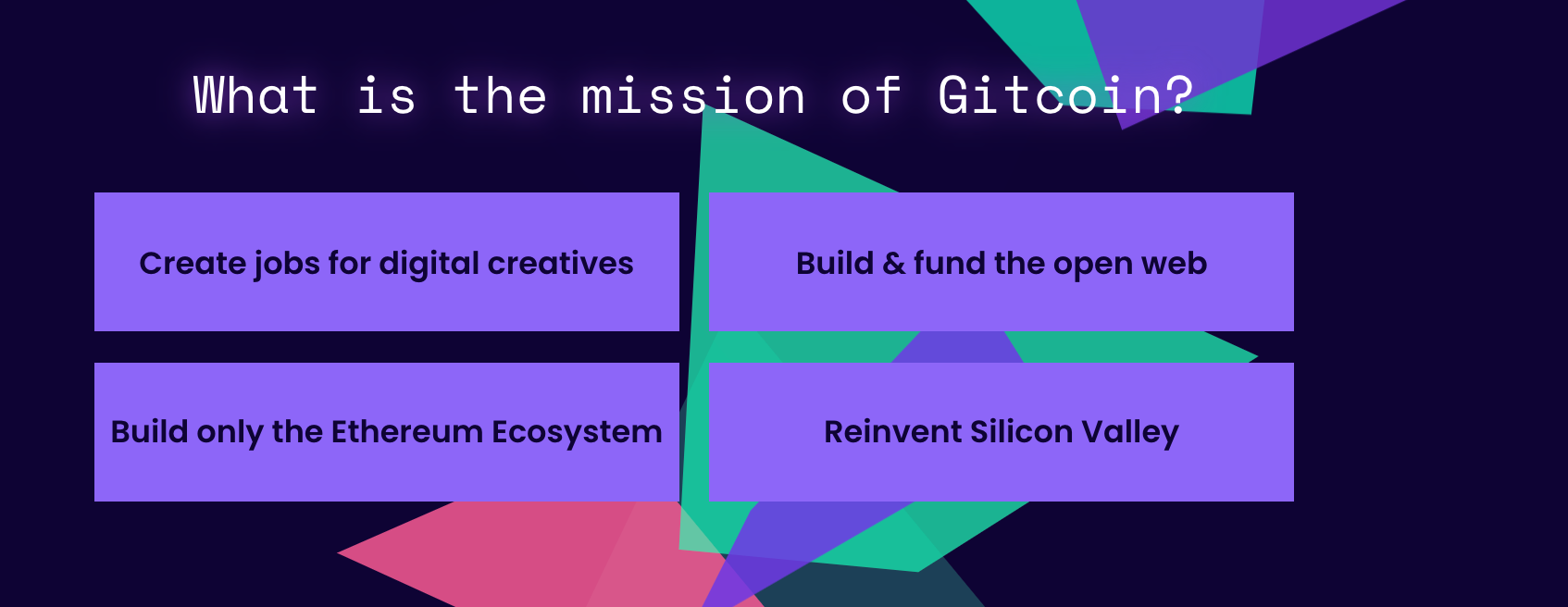 - Proof of Knowledge kicks off with a quick 2-3 minute video stating Gitcoinâs core mission. Watch it and answer the two questions to complete this mission.