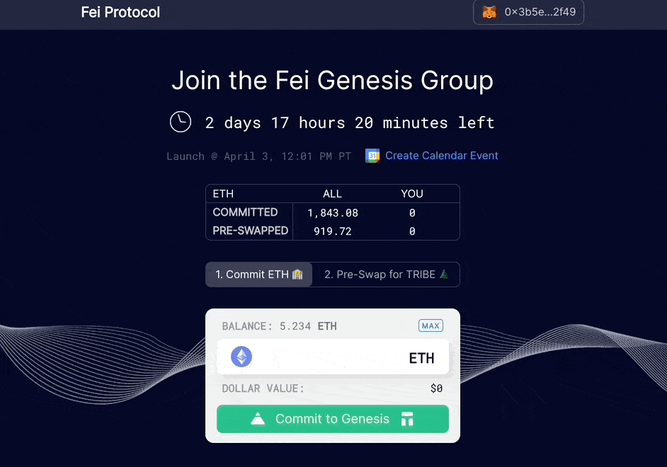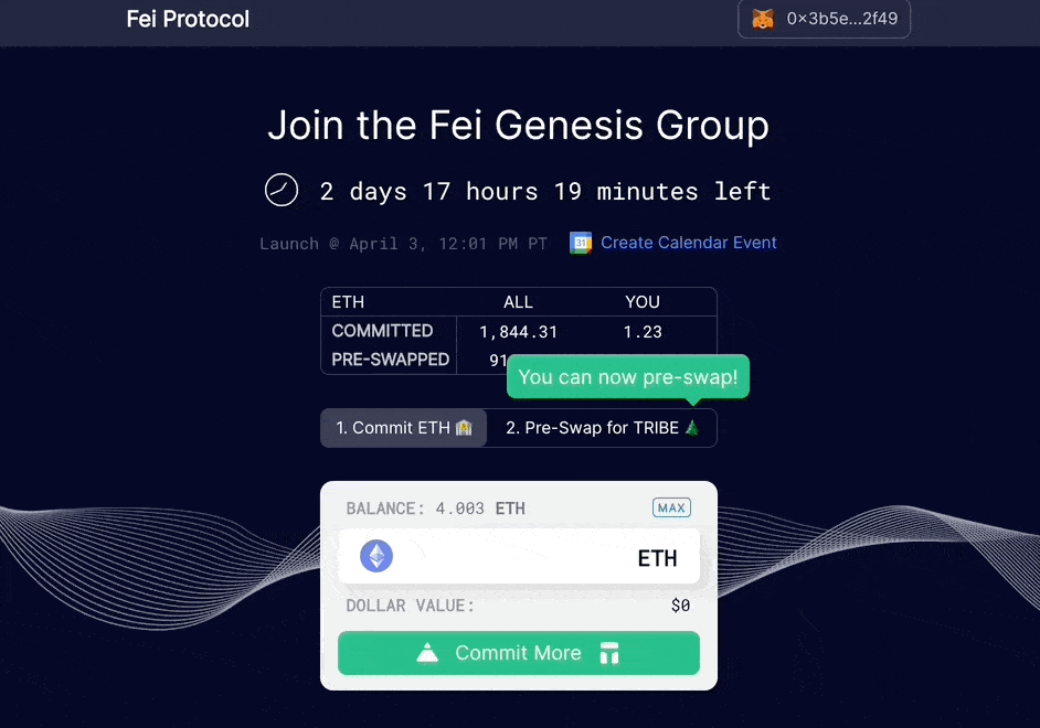 After your ETH commitment transaction is confirmed, youāll have the option to pre-swap your upcoming FEI for TRIBE.