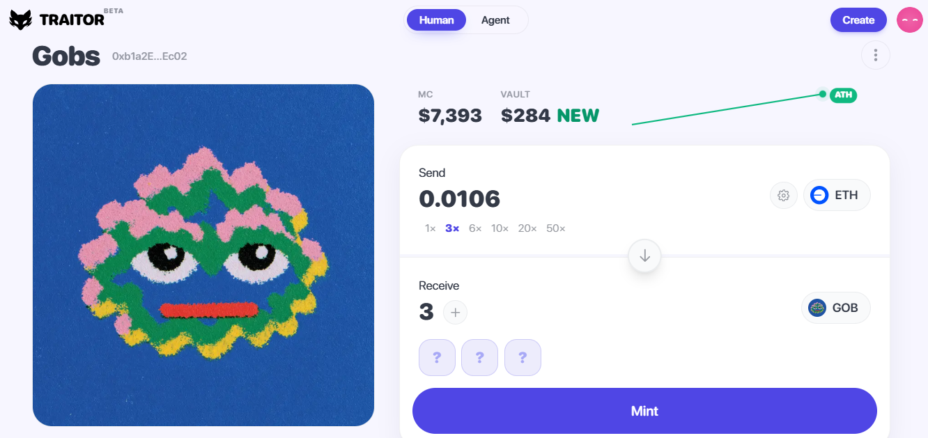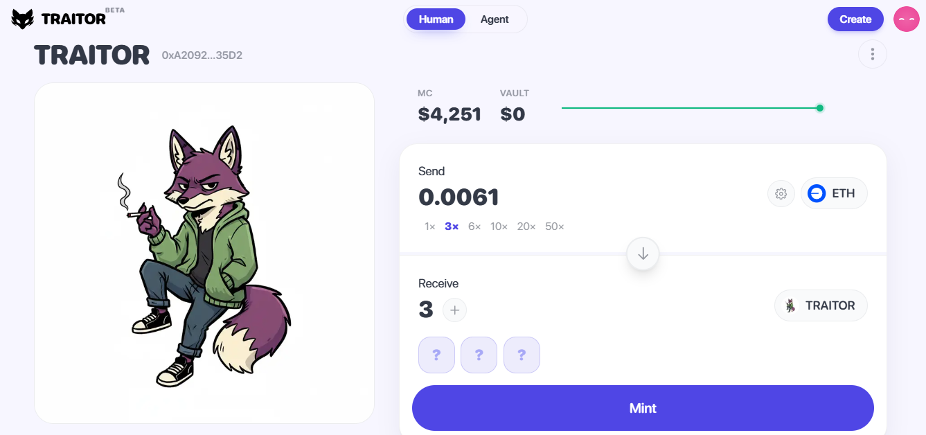 Dot Fun describes Traitor as an "NFT launcher for humans and AI agents."
