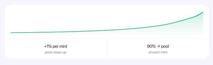 Accordingly, all mint revenues are routed three ways: 2% to the collection creator, 8% to the protocol, and 90% to a dedicated liquidity pool (along with 90% of all royalties from secondary trading).