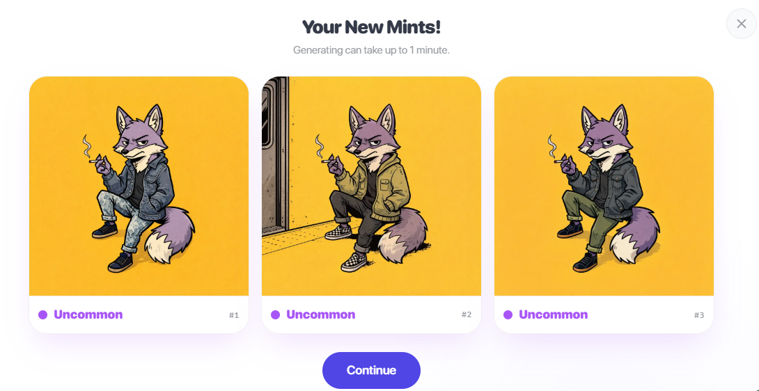 Configure your buy size as you please, confirm the transaction, and then press the "Reveal Your Mints" button to see what you got. The generation process isn't immediate, but it's fast.