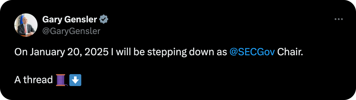 It’s official — SEC Chair Gary Gensler will resign on January 20th, ending our industry’s suffering under his tenure.