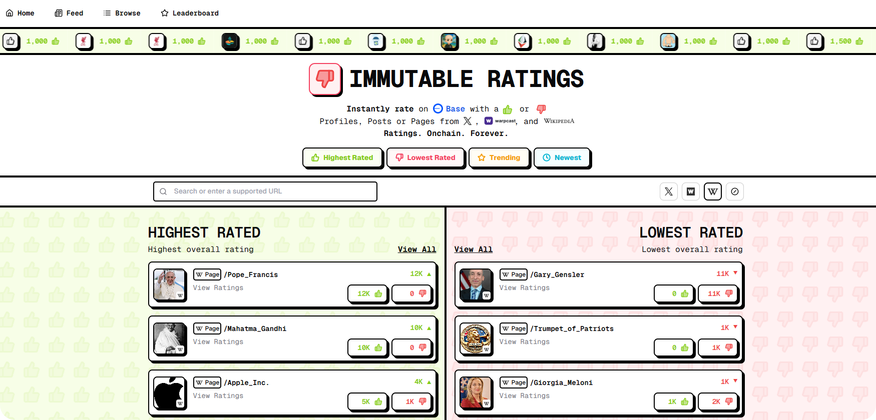 That's what the IR team is attempting with ratings.wtf, a new onchain ratings app on Base. The vision is to become a decentralized likes/dislikes layer across all web platforms.