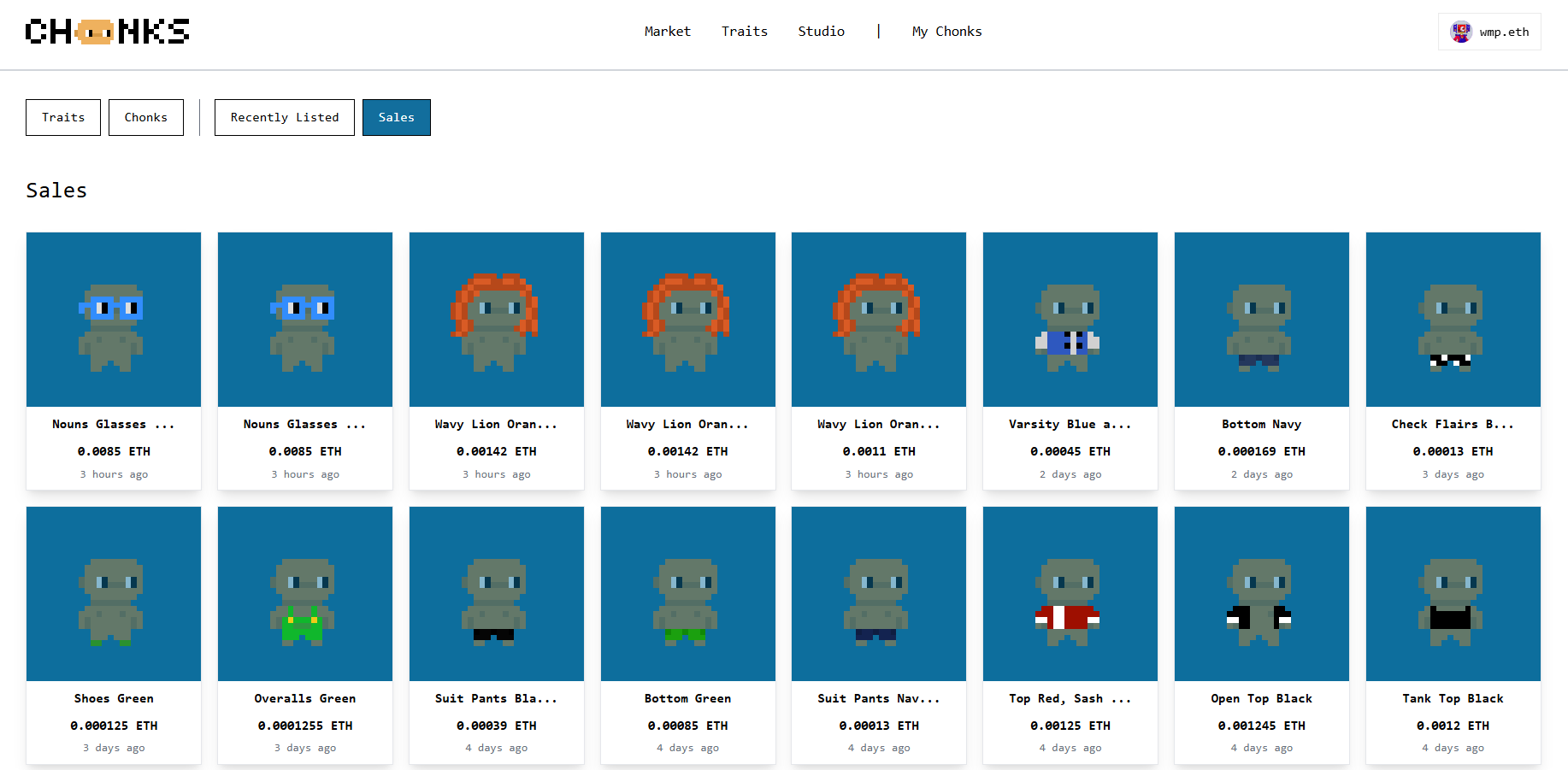 To address this pitfall, the Chonks team built their own custom marketplace from scratch, the Chonks Marketplace. It's designed to prevent front-running risks by automatically delisting any Chonk whose traits are transferred or individual traits when they're moved, too.