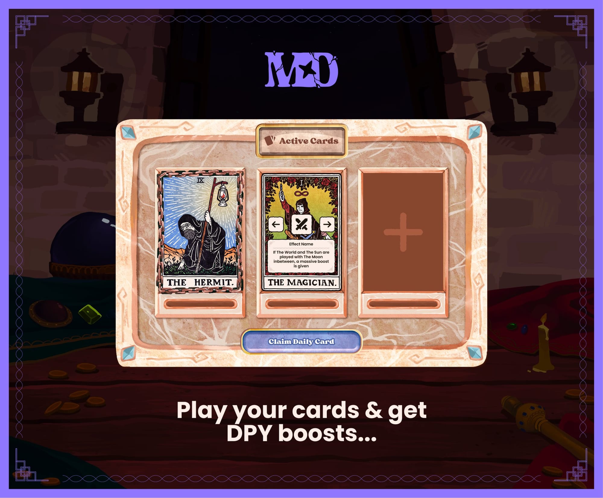 - Once the title is live, players here will stake MYSTIC tokens to earn daily yield (DPY) and collect NFT cards that can raise or lower their returns, with rare cards offering the biggest boosts.