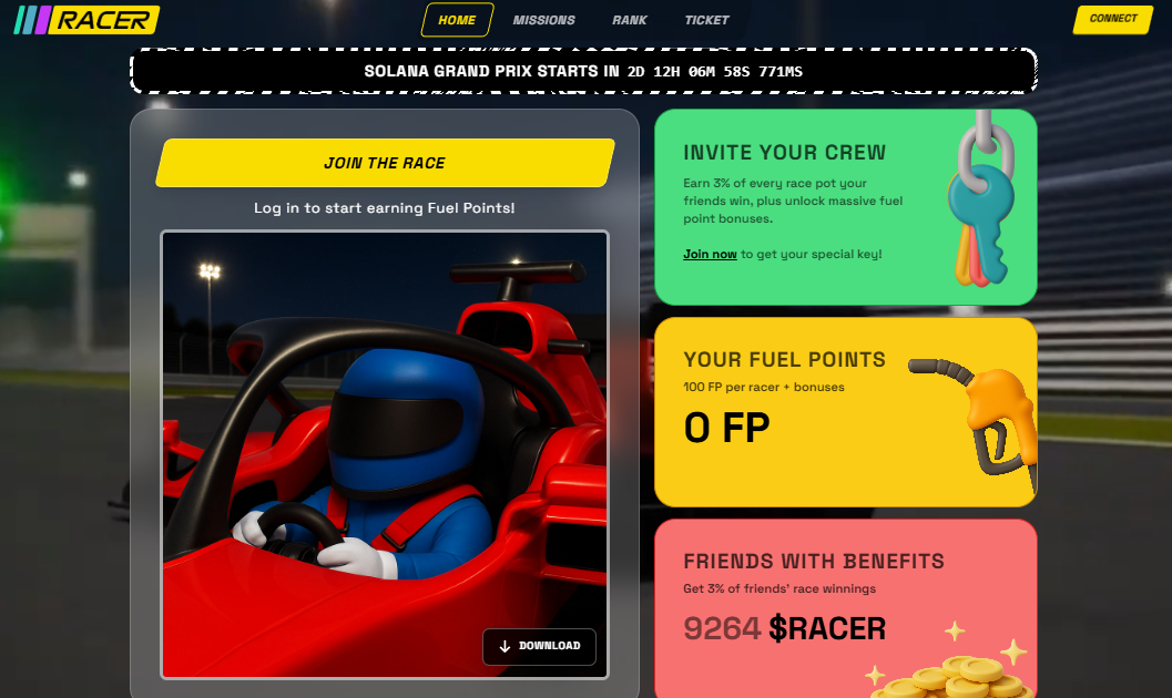 - The game's 1st week-long season, the Solana Grand Prix, starts this Thursday, Nov. 13th. Minting an SGP ticket grants you the "driver" role, offering you the ability to launch a team and earn a 10% cut of your team's winnings per race. With +117,000 mints already, there's plenty of early interest.