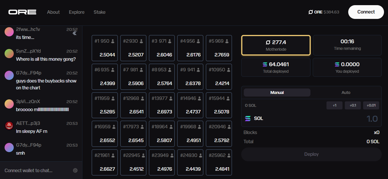 - Additionally, a rare "motherlode" event can drop extra ORE rewards to all of a round's winners, while every round also channels 10% of SOL volume into automatic buybacks and burying (i.e. burning) ORE, creating deflationary pressure.