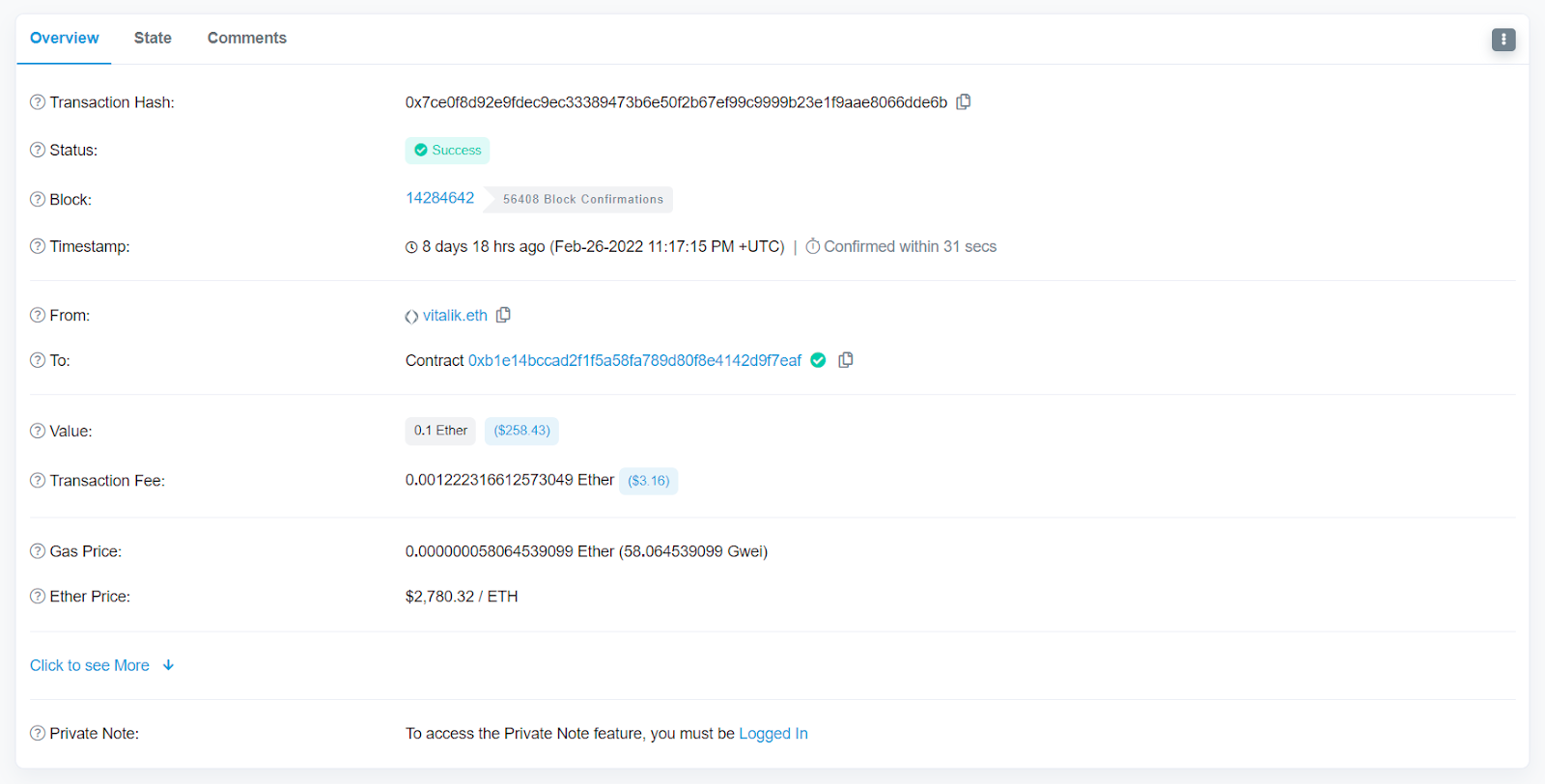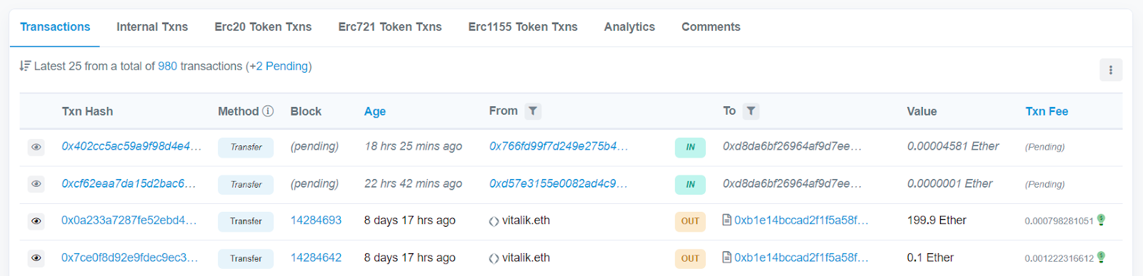 - In the first transaction visible below, we can see Buterin sent a test transaction of 0.1 ETH to an address as a precaution before sending a much larger sum, 199.9 ETH, to the same address immediately thereafter.