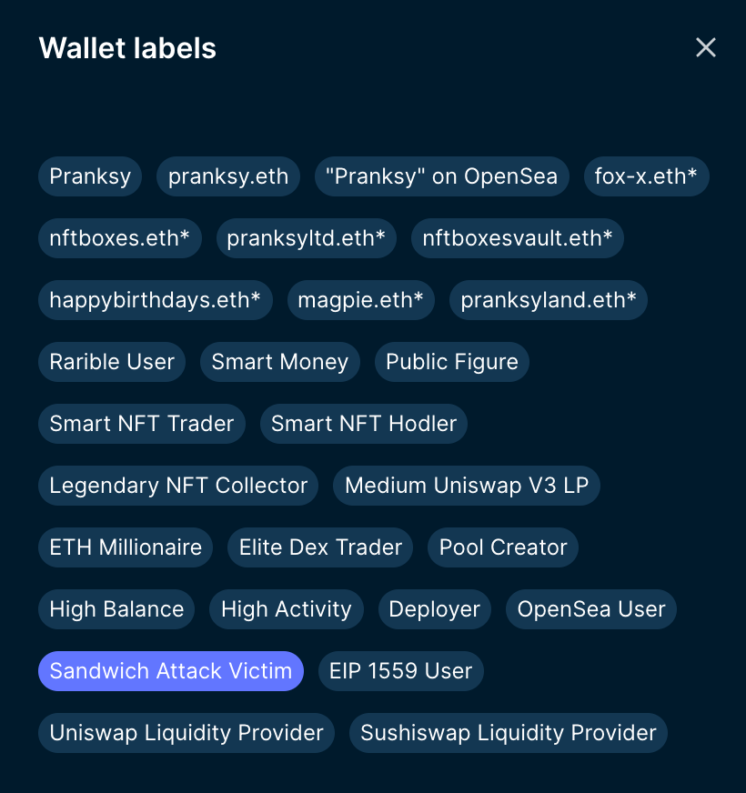 - Nansen also makes use of a wallet labeling system that makes it very simple to parse transaction flows. For instance, legendary NFT collector Pranksy has his main wallet labeled as depicted below.