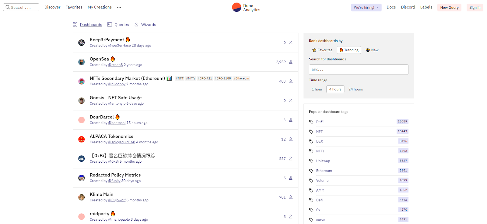 - SQL developers can use the platform to create new Dune Dashboards, which track key data around a given project or topic. For instance, in the image above you can see dashboards tracking activity around OpenSea, Gnosis Safe NFT usage, and so forth.