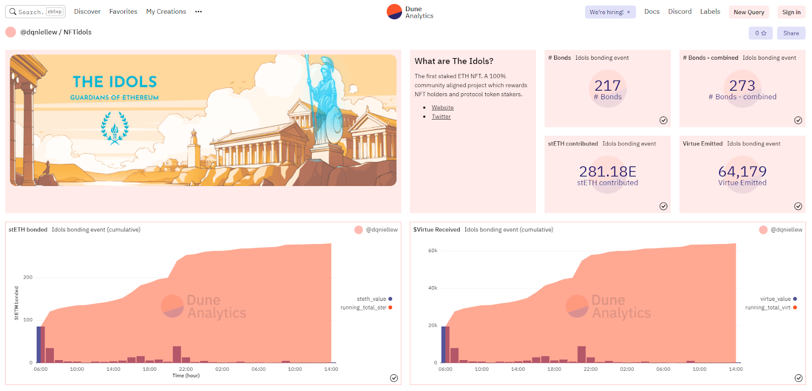 - For example, Dune user @dqniellew recently created a new Dune Dashboard for tracking info about The Idols, an NFT project whose NFTs are imbued with Lido staked ETH (stETH). This dashboard’s useful for visualizing the early activity around the collection.