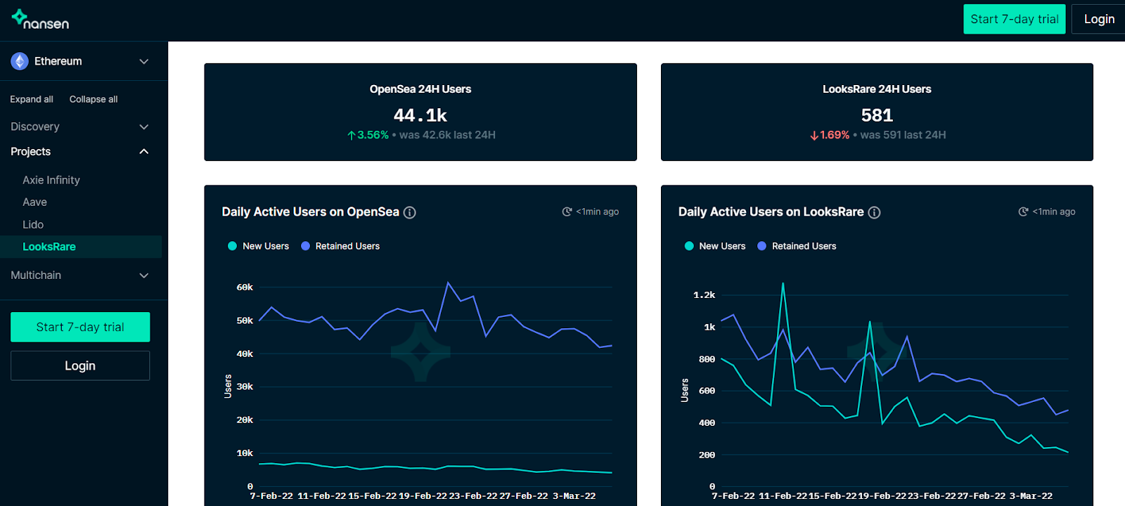 - You could head over to Nansen’s public LooksRare dashboard and compare the two marketplaces on 24-hr users, daily active users, and so forth. In the image above you can see LooksRare’s DAUs have been trending down in Feb. 2022, so that might affect your choice.