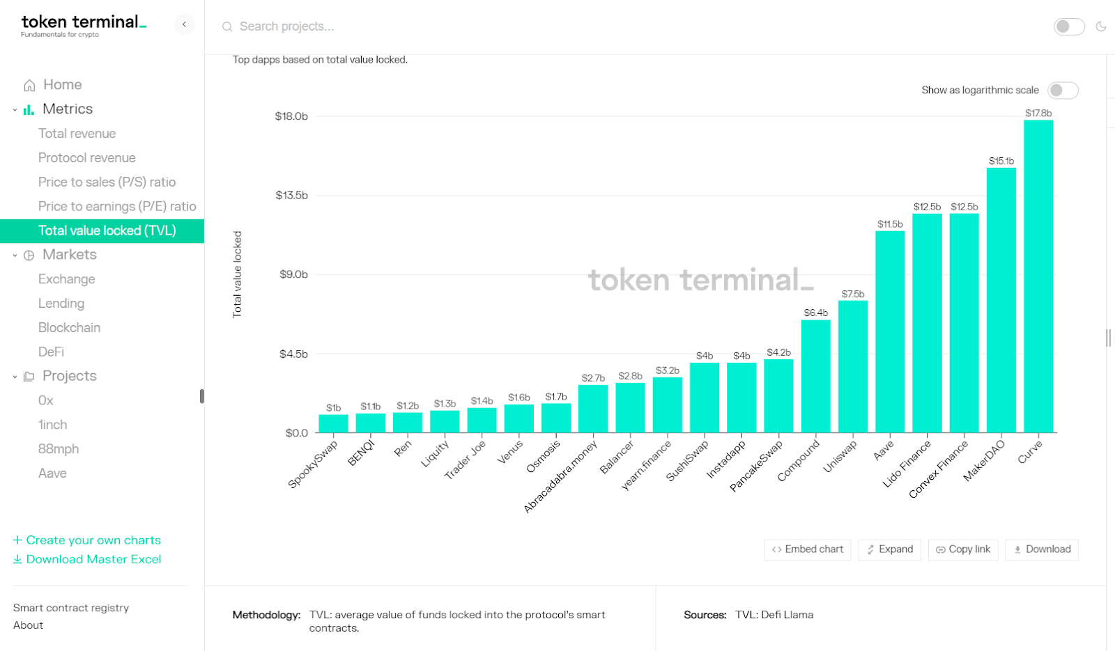 - Token Terminal can be particularly useful for visualizing the total value locked (TVL) in top dapps across all chains, e.g. Ethereum, alt-L1s, L2s, etc.