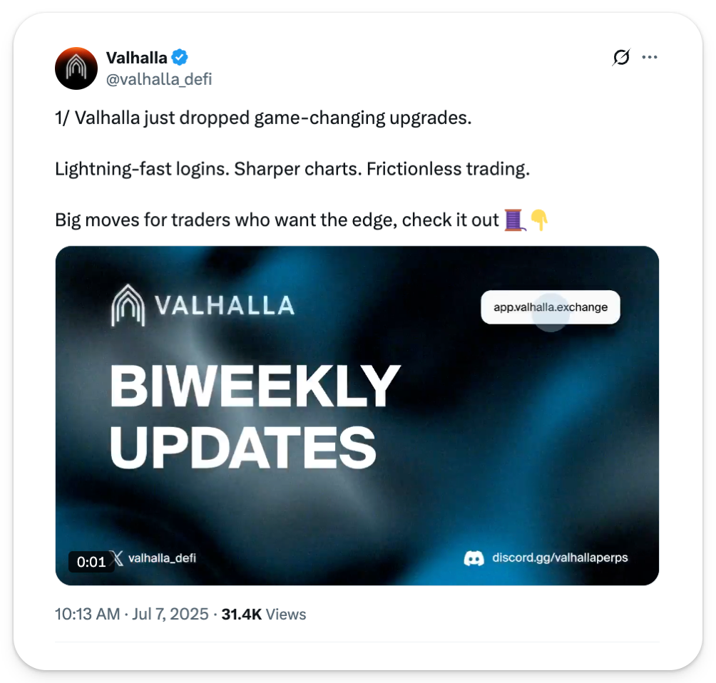 The Valhalla Testnet is now live, serving as a public sandbox for traders and developers to explore the platform before mainnet deployment. Additional details on the impending mainnet launch and an airdrop points program are being teased for the near future.