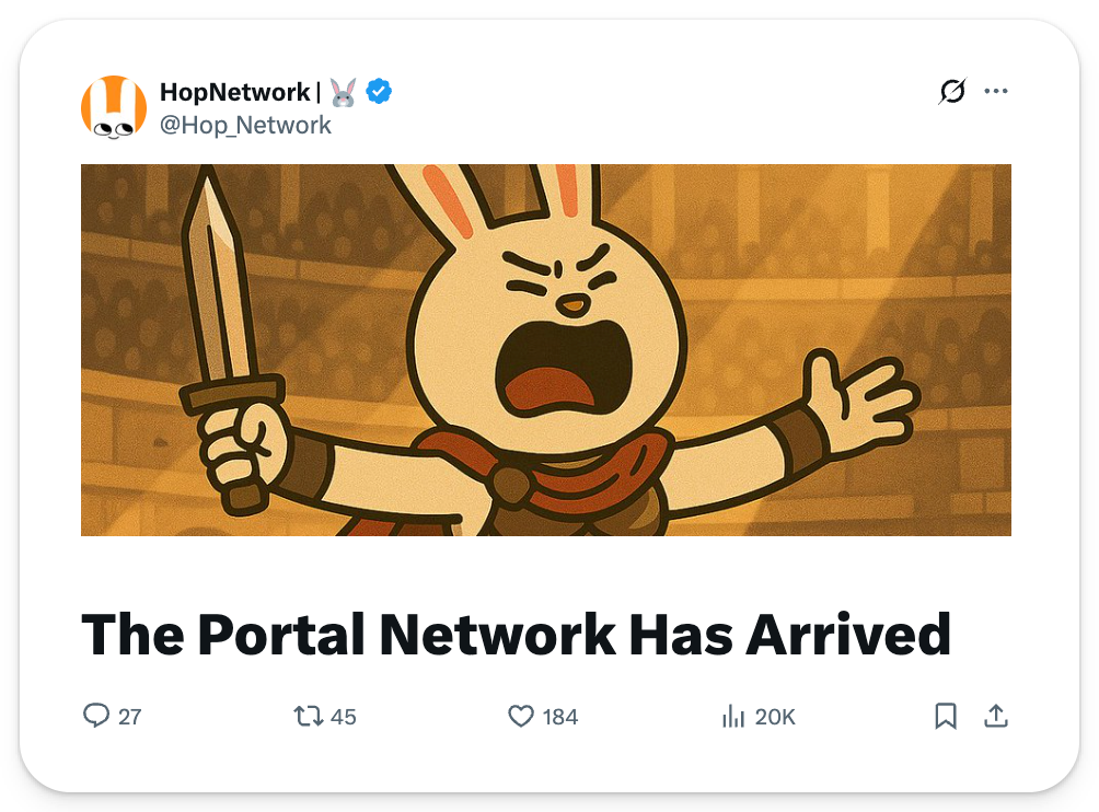 HOP is building the Portal Network, a decentralized mesh of nodes that lets users hop around the internet freely, instantly, and anonymously. Built on MegaETH and secured by EigenLayer, HOP hopes to redefine digital mobility by delivering near-instant, censorship-resistant connectivity with enterprise-grade reliability.