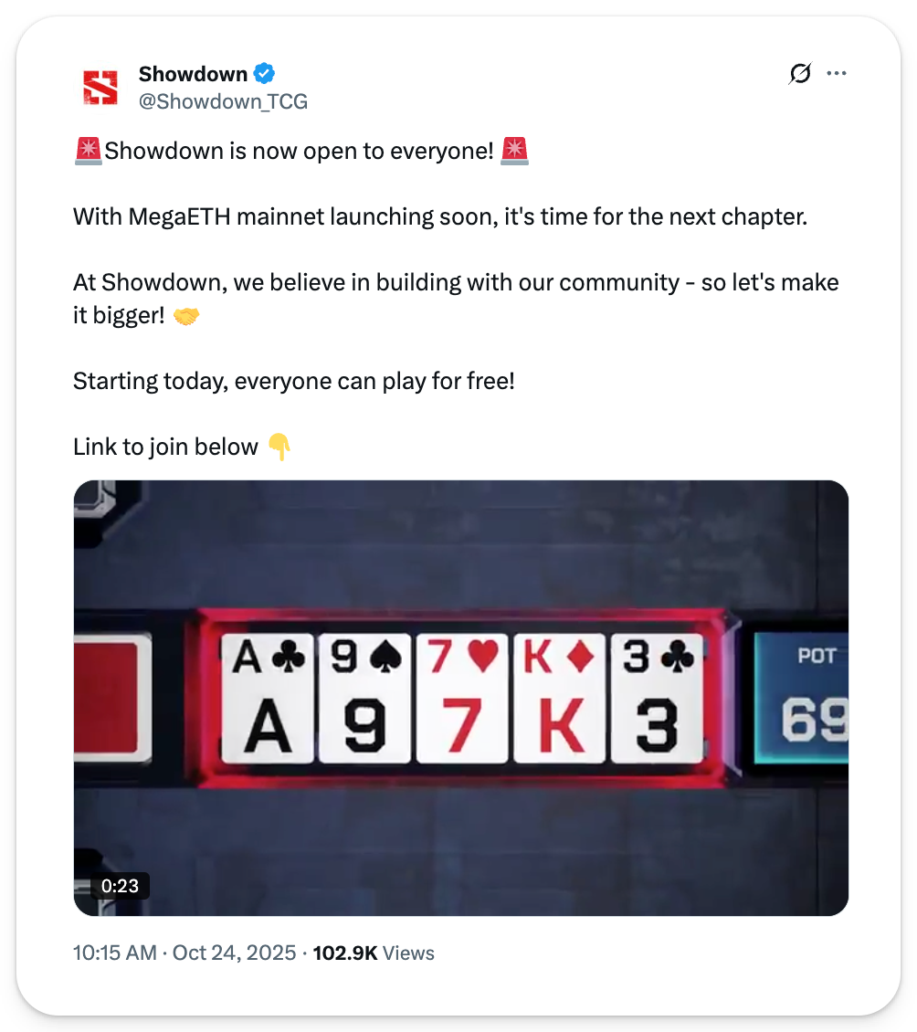 On October 24, Showdown shipped “Open Alpha” of its crypto-enabled poker game as free-to-play and available to everyone. Just follow the link in the post below to get started with Showdown.