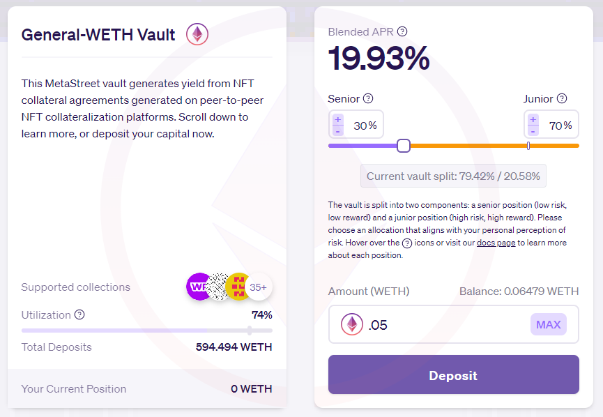 Here, the idea is depositing into one of MetaStreet’s Capital Vaults for passive earnings. Since depositors can choose how much of their funds are split between senior (higher-risk) and junior (lower-risk) vault positions, how much APR you earn depends on how you blend your exposure. For instance, a 30/70 senior/junior split through the General-WETH Vault would generate ~20% APR at the moment.