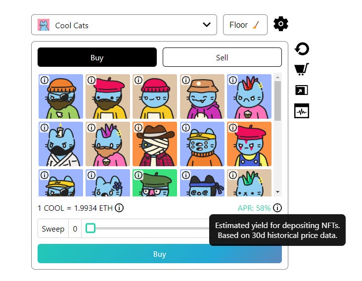 LPs on Caviar earn yield from a 1% fee that’s charged on every Caviar NFT swap. As more people trade through a given pool, that pool’s LPs earn more yield accordingly. The strat here, then, is LPing with ETH and NFTs in an active Caviar pool to profit from trading activity over time. For example, as you can see in the screenshot below, Cool Cats LPs on Caviar are currently earning 58% APR as based on the past 30 days of trading activity.