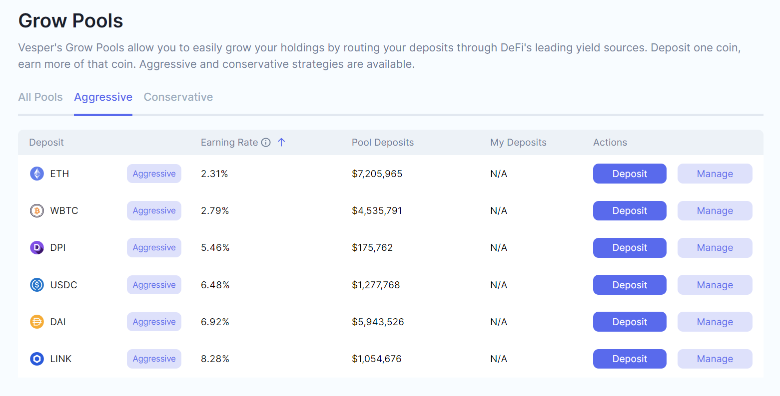- Vesper’s Grow Pools collect users’ deposits and then puts them to work in yield strategies that “buy back more of the pool’s deposit assets and translate the accumulation into passive returns for pool participants.” Both conservative and aggressive strategies are available.