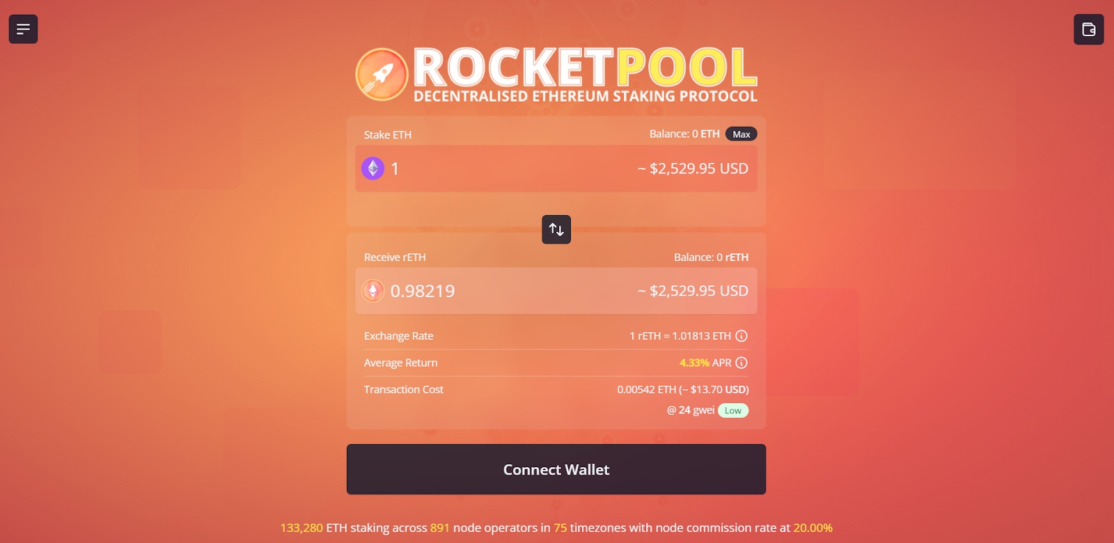 - Go to stake.rocketpool.net and connect your wallet.