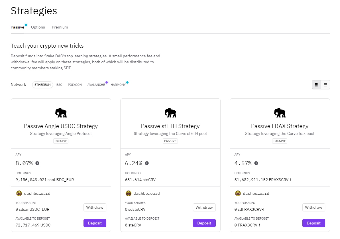 - One of Stake DAO’s more popular strategies is its Passive stETH strategy, which earns users’ yield on LP tokens from Curve’s stETH pool (a “similarly-priced” assets pool composed of ETH and stETH, or Lido Staked ETH).