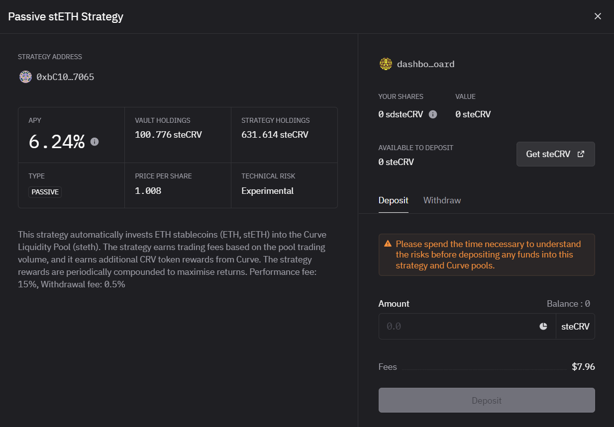 - When you’re ready to exit the position you can unwind by using the strategy’s “Withdraw” button for all of the sdsteCRV tokens in your wallet. You’ll receive steCRV, which you can withdraw into ETH back on Curve.