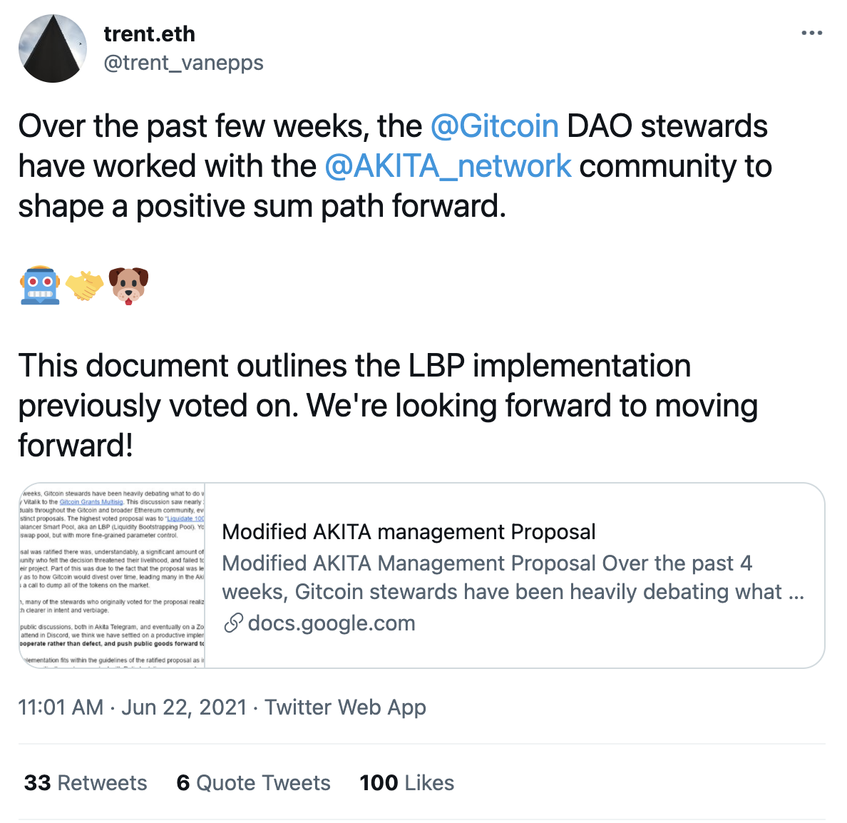 We’ll call it the MTT—Massive Token Transfer. By shifting the center of gravity of the AKITA community into Gitcoin governance, the two communities collided in a major way. Whether these two communities create positive sum outcomes for each other and for the world remains to be seen.