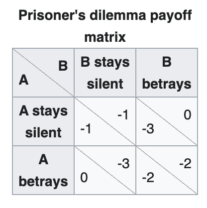 - If A and B each betray the other, each of them serves two years in prison