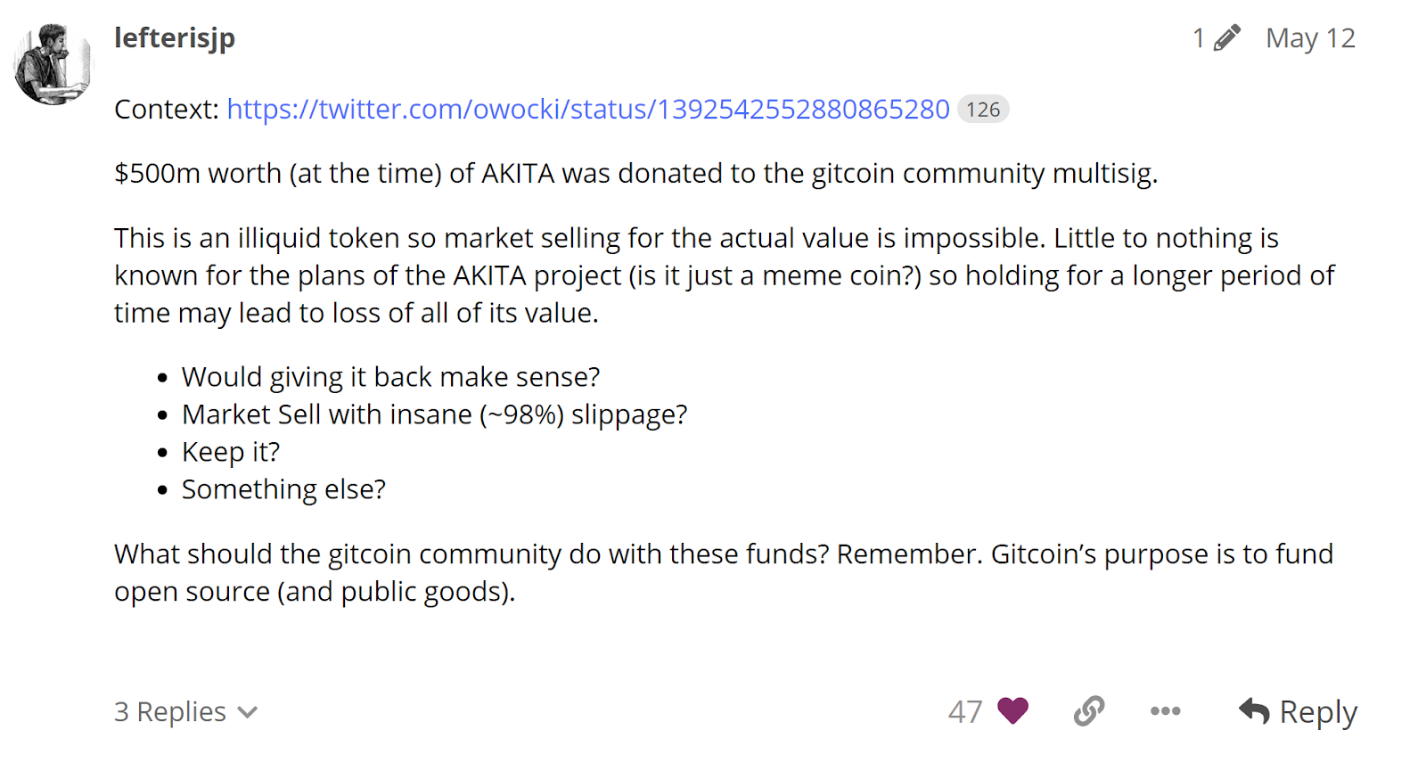 - Proposal from @tjayrush proposing the Gitcoin community return the AKITA funds to their source (Vitalik's sending address).