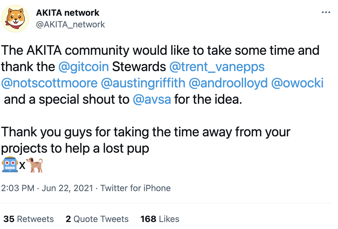 - Proposal from @castall proposing the Gitcoin community use AKITA as part of the next quadratic matching pool (in current and future rounds).