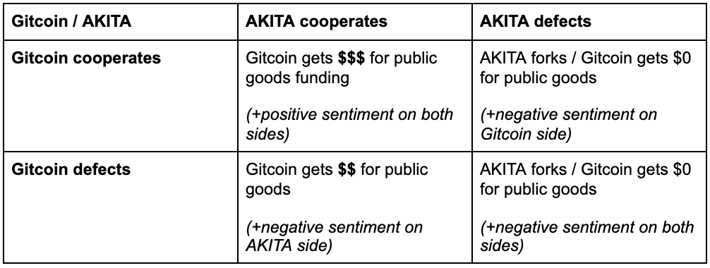 Now let's look at the 2x2 payoff matrix for Gitcoin/AKITA: