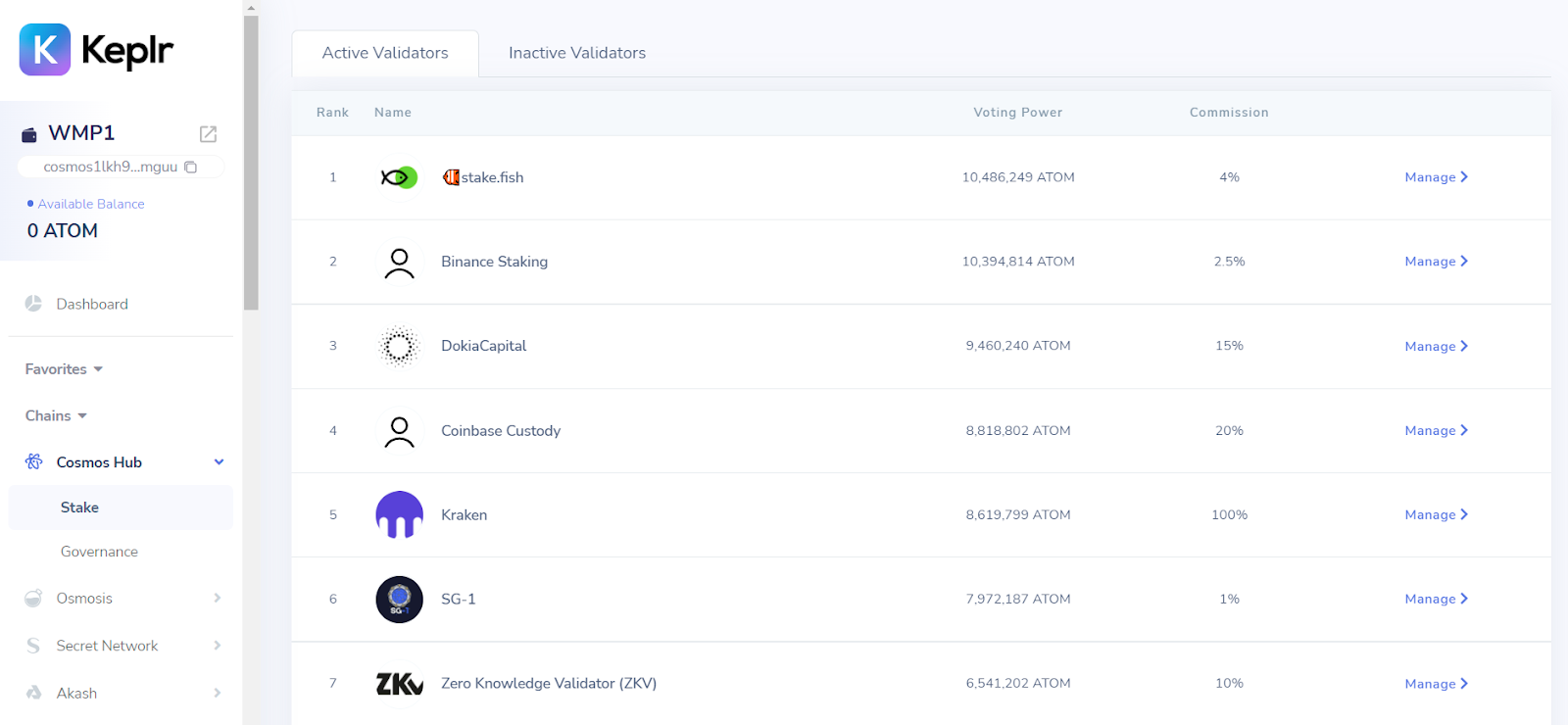 - Review the available validators (the commission % is how much a validator keeps from ATOM rewards)