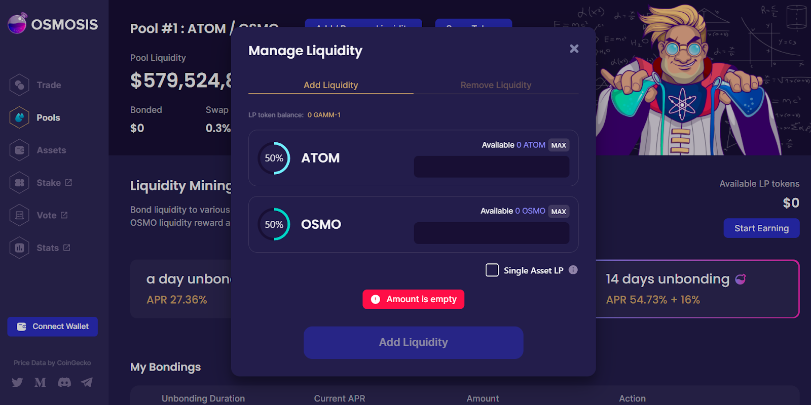 Moreover, the same familiarity is true when it comes to providing liquidity into these project’s liquidity pools. You select your pool of choice, input the amount of liquidity you want to supply, and then confirm the deposit through a Keplr pop-up.
