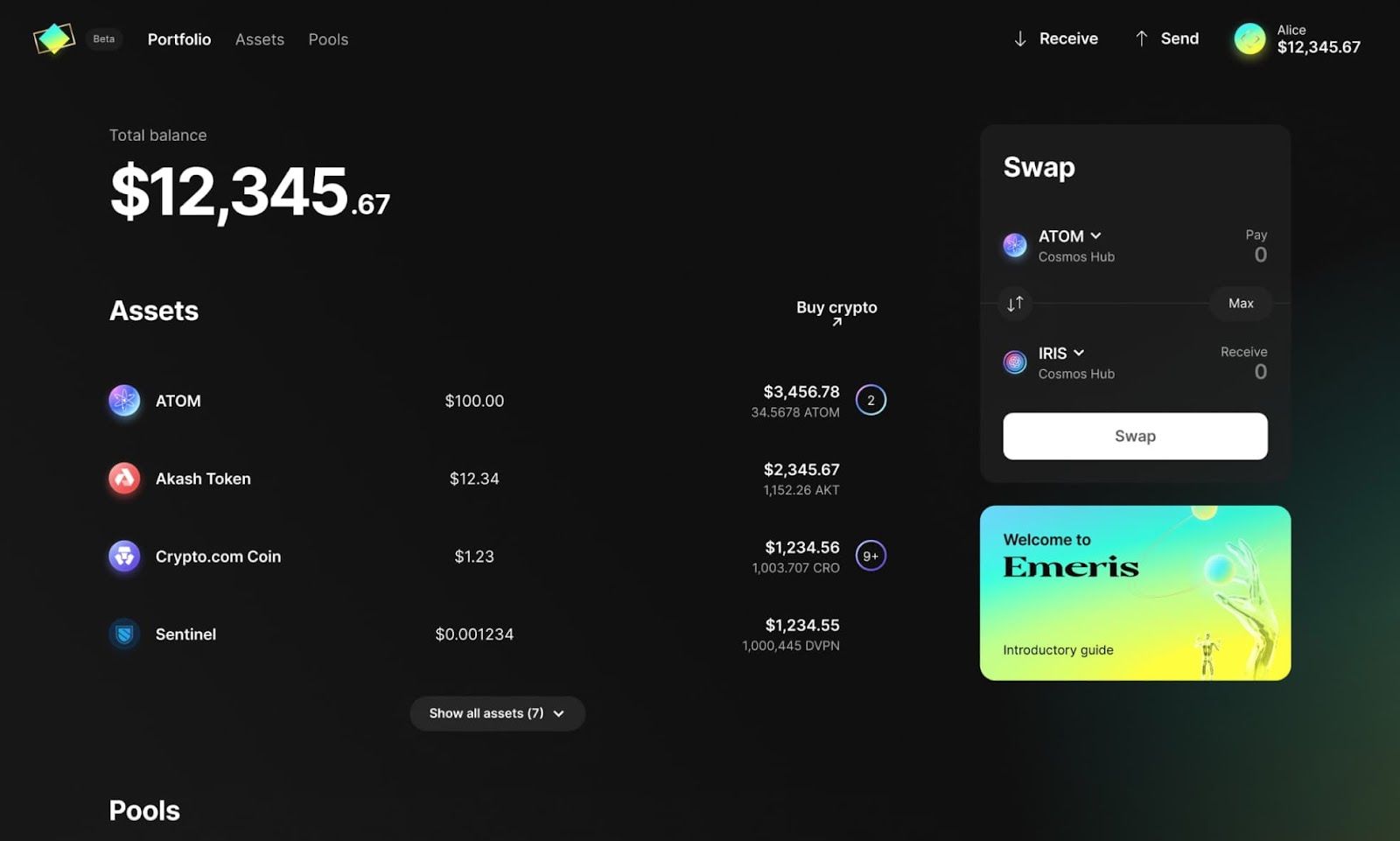 - Voila! You’re in. You can now use Emeris to buy ATOM (via Simplex), receive and send Cosmos ecosystem assets, trade (powered by Gravity DEX), provide liquidity, and later more.