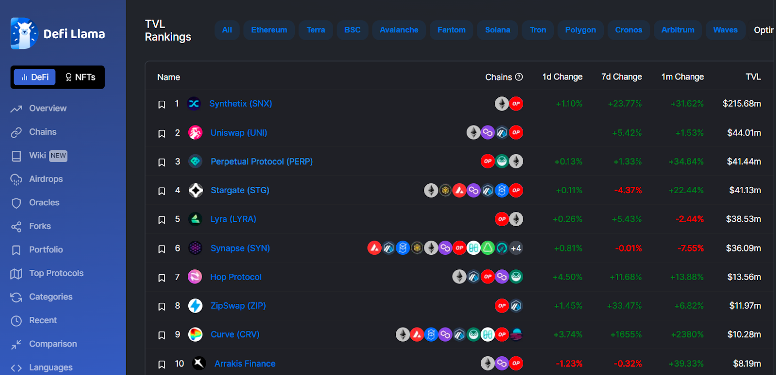 With +$200M total value locked (TVL) on Optimism, synthetic assets protocol Synthetix is presently the largest dapp on the L2. No surprise there, though, as Synthetix was one of the first dapps to embrace Optimism, so its first-mover advantage has translated into considerable early inertia on the L2.