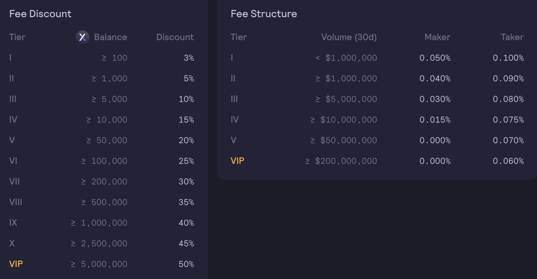 While not a direct earning opportunity, it’s worth highlighting that the protocol offers trading discounts for those that hold DYDX tokens as well as volume-based discounts. Trading fee discounts range from 3% for holding 100 DYDX to 50% for those VIP members that hold north of 5M DYDX. The full breakdown on the discounts is broken down below: