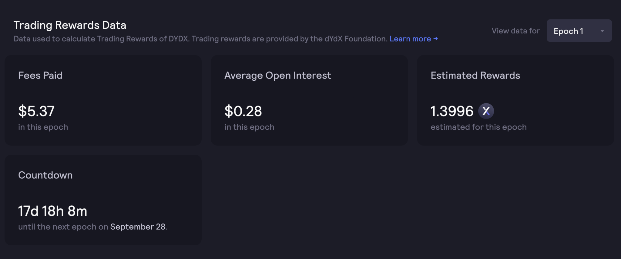 🧠 Note: These rewards are estimates and may go down over the course of an epoch as more trading volume occurs on the exchange. This is especially true if you do not continue trading throughout the epoch.