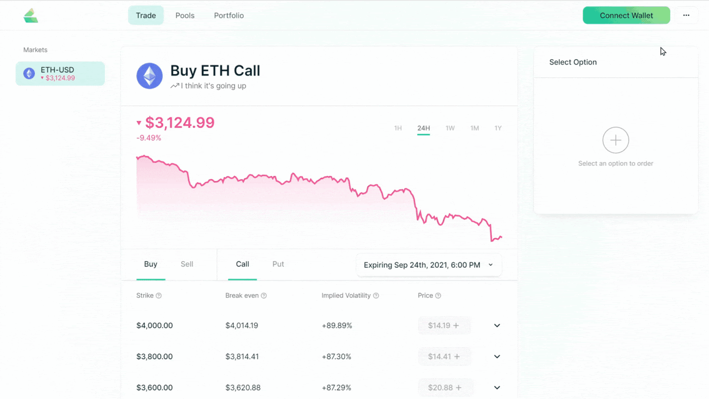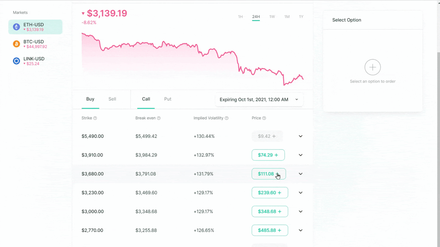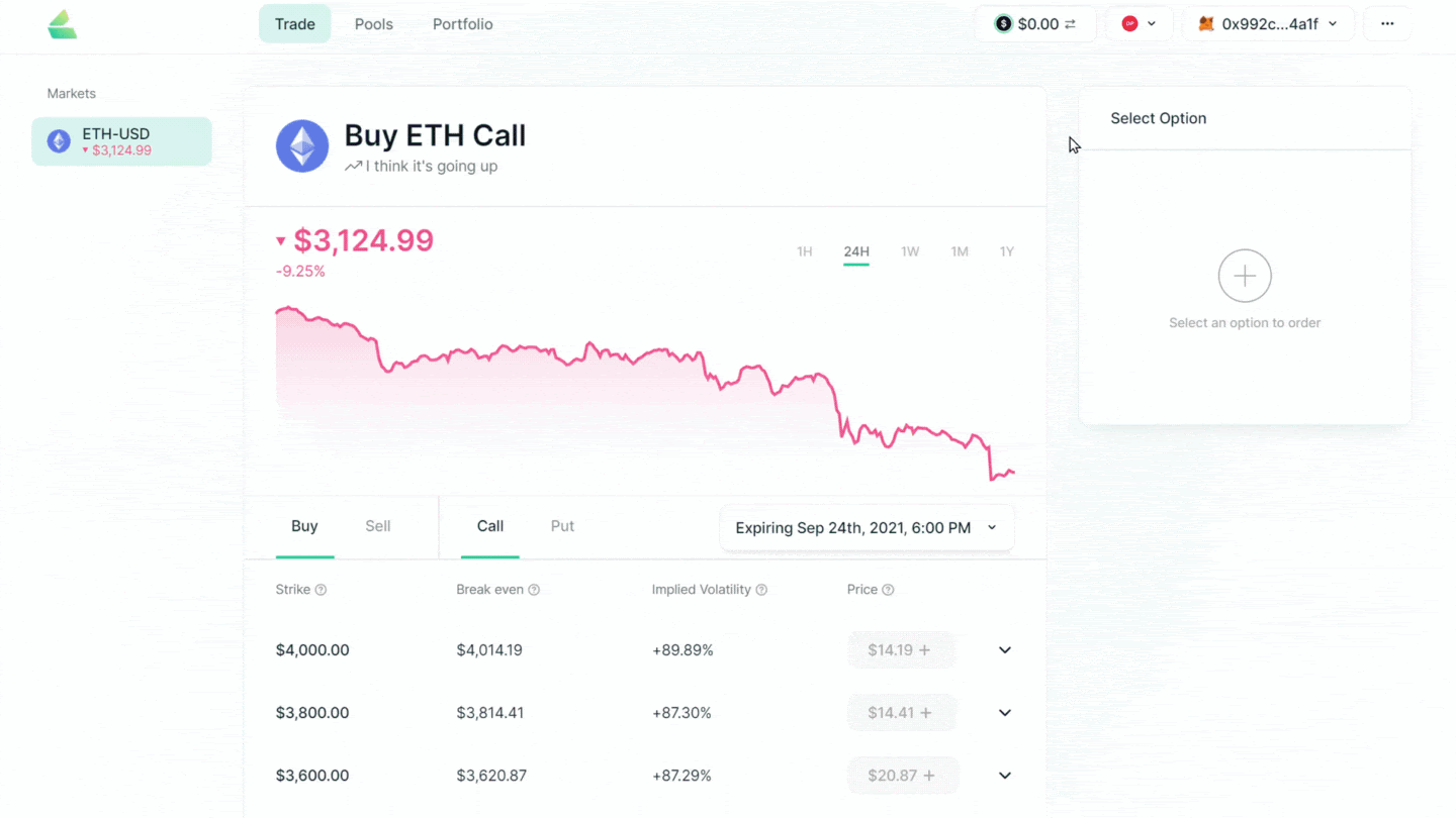 Enter the number of options you wish to purchase or sell and approve the transaction in Metamask.