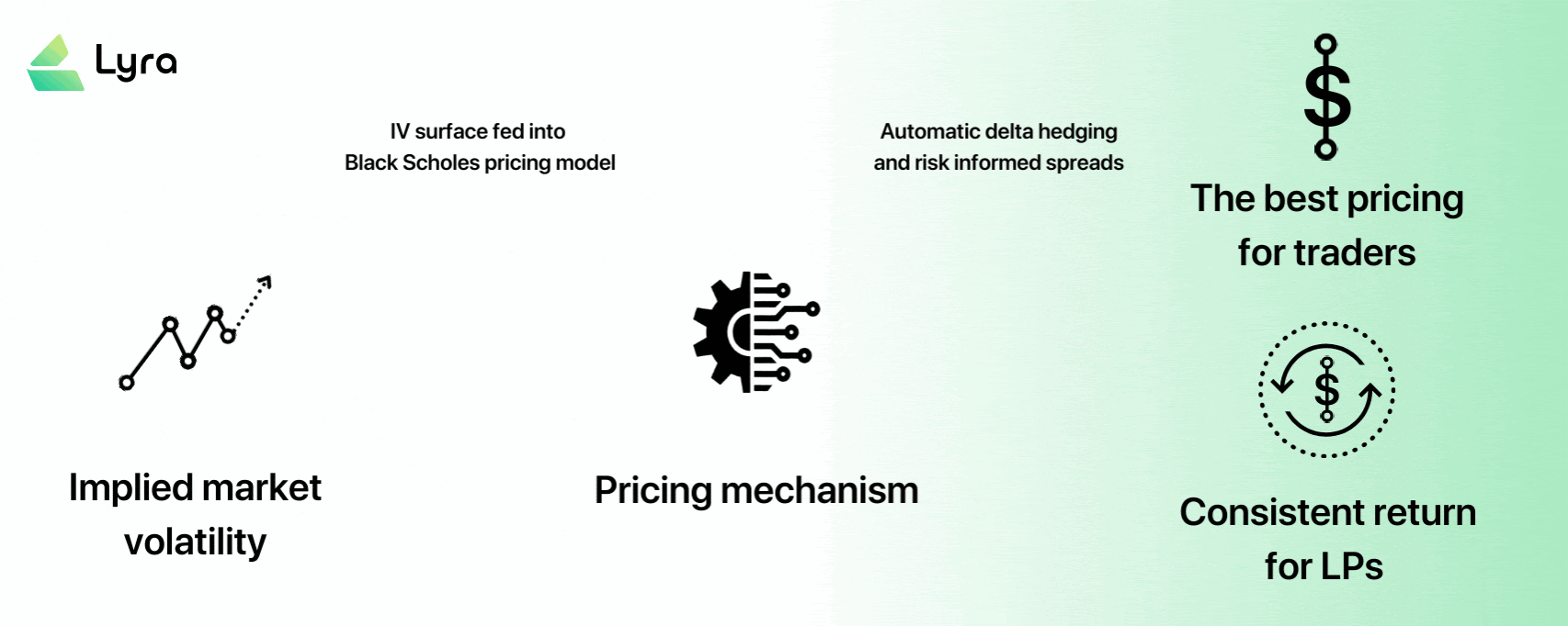 Lyra uses market demand and supply to update the implied volatility surface for each expiry. This surface is then fed into the Black Scholes pricing model to determine prices for all listed options, yielding performant pricing for traders and steady returns for LPs.