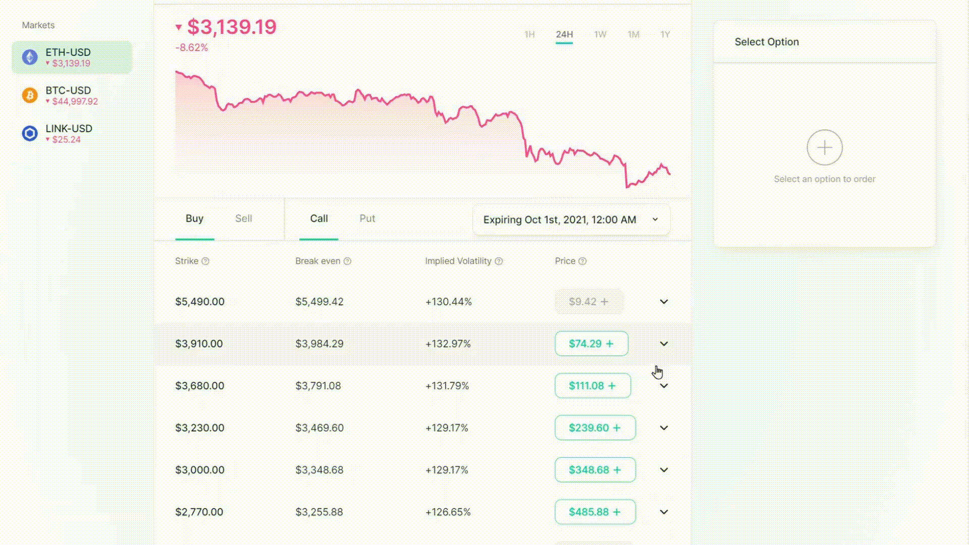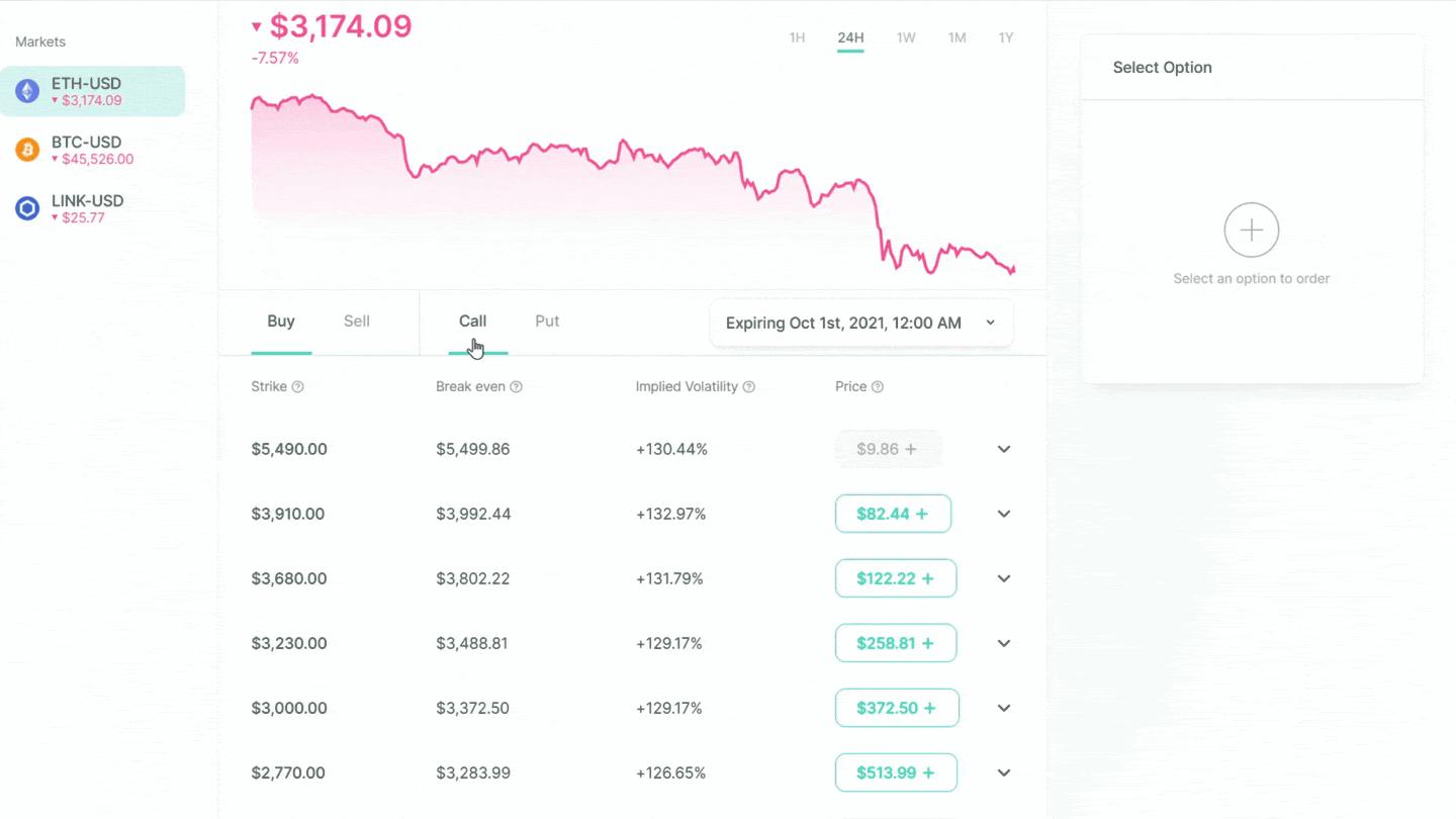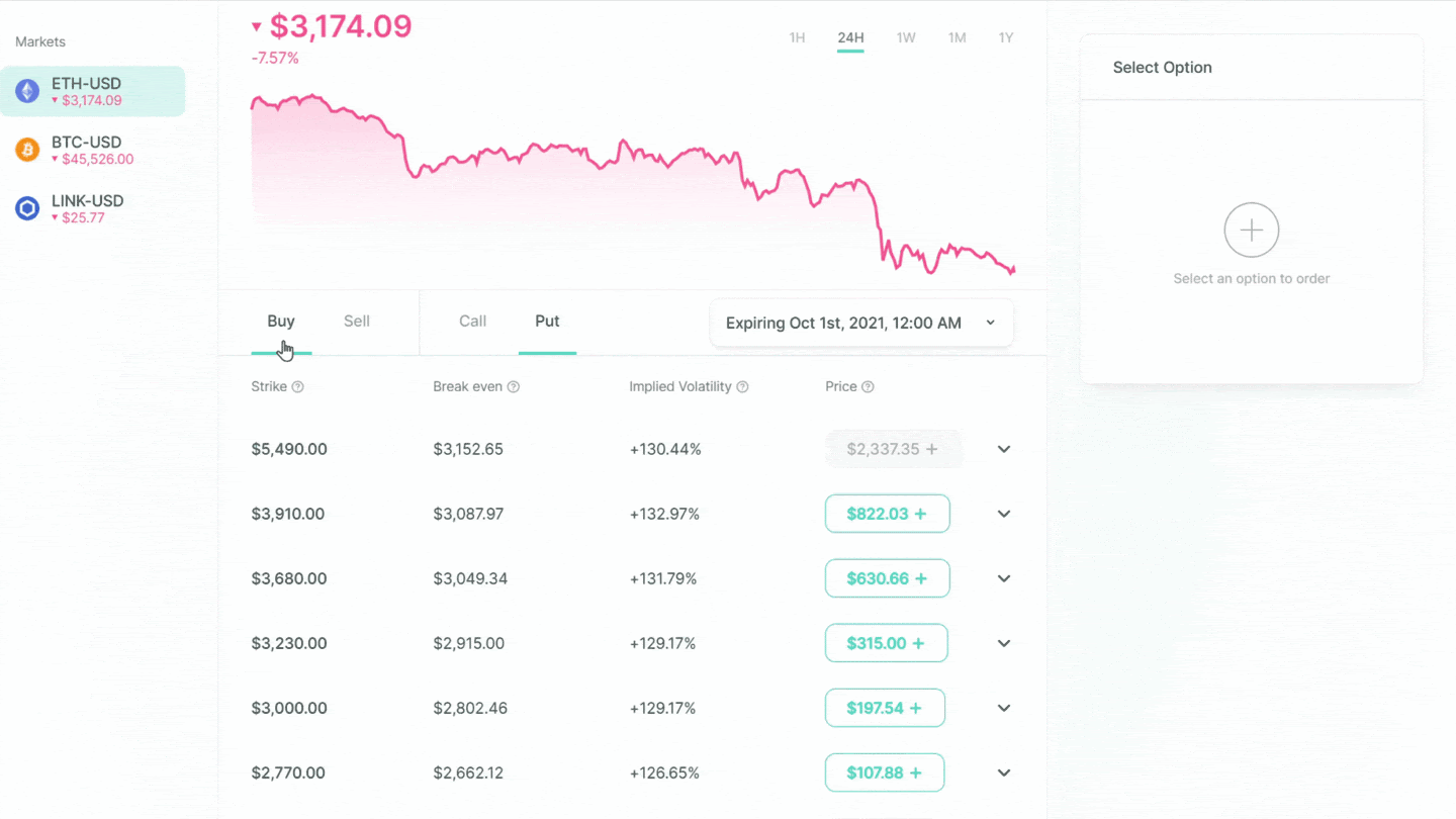 Traders may buy options to speculate on whether a token will increase or decrease and take a leveraged position at a lower premium than actually purchasing the underlying asset.