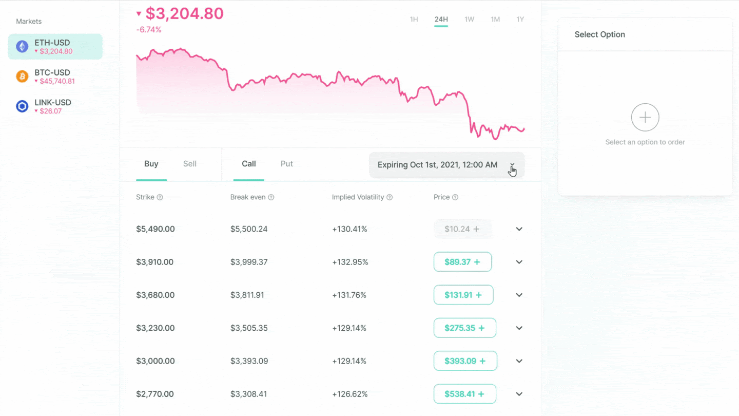 You can select your desired expiry using the dropdown on the trade page. The list of strikes will update to reflect the available options for your selected expiry.