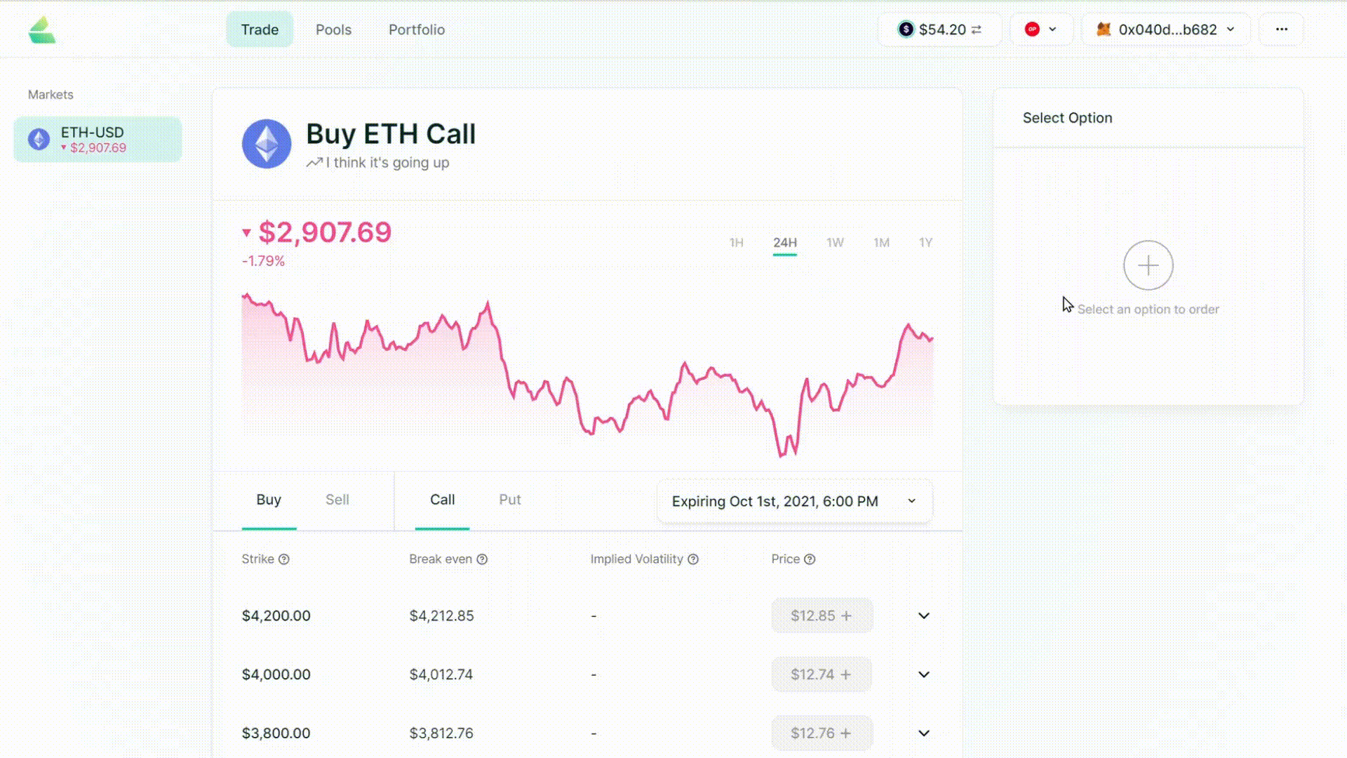 You’ll need sUSD, a synthetic stablecoin, to open long positions and short puts, and you’ll need sETH as collateral for short calls. To seamlessly acquire synths, you’ll be prompted to swap to the minimum amount of the synth you need to open a position without having to leave the dApp.