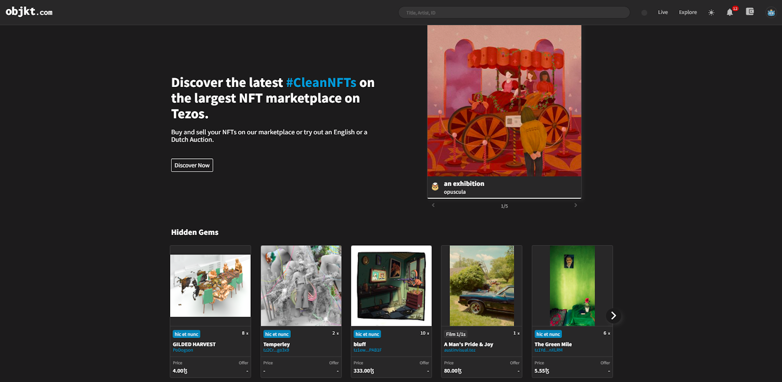 Last year, the Tezos cryptoart marketplace that really brought the Tezos NFT scene to life was Hic et Nunc (HEN), yet that project has since faced some tribulations and in turn has given way to newer Tezos NFT projects like objkt.com and fxhash.