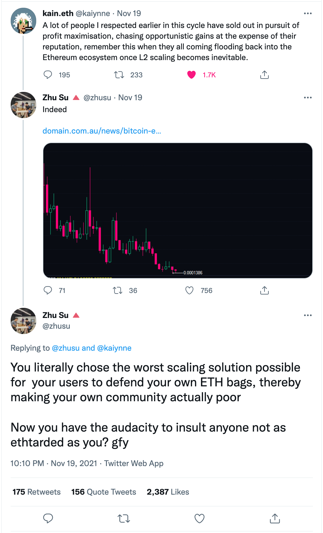 Su Zhu responds to this tweet, claiming hypocrisy due to Kain selling a portion of his SNX tokens to purchase a ~$50m worth of real estate in Australia.