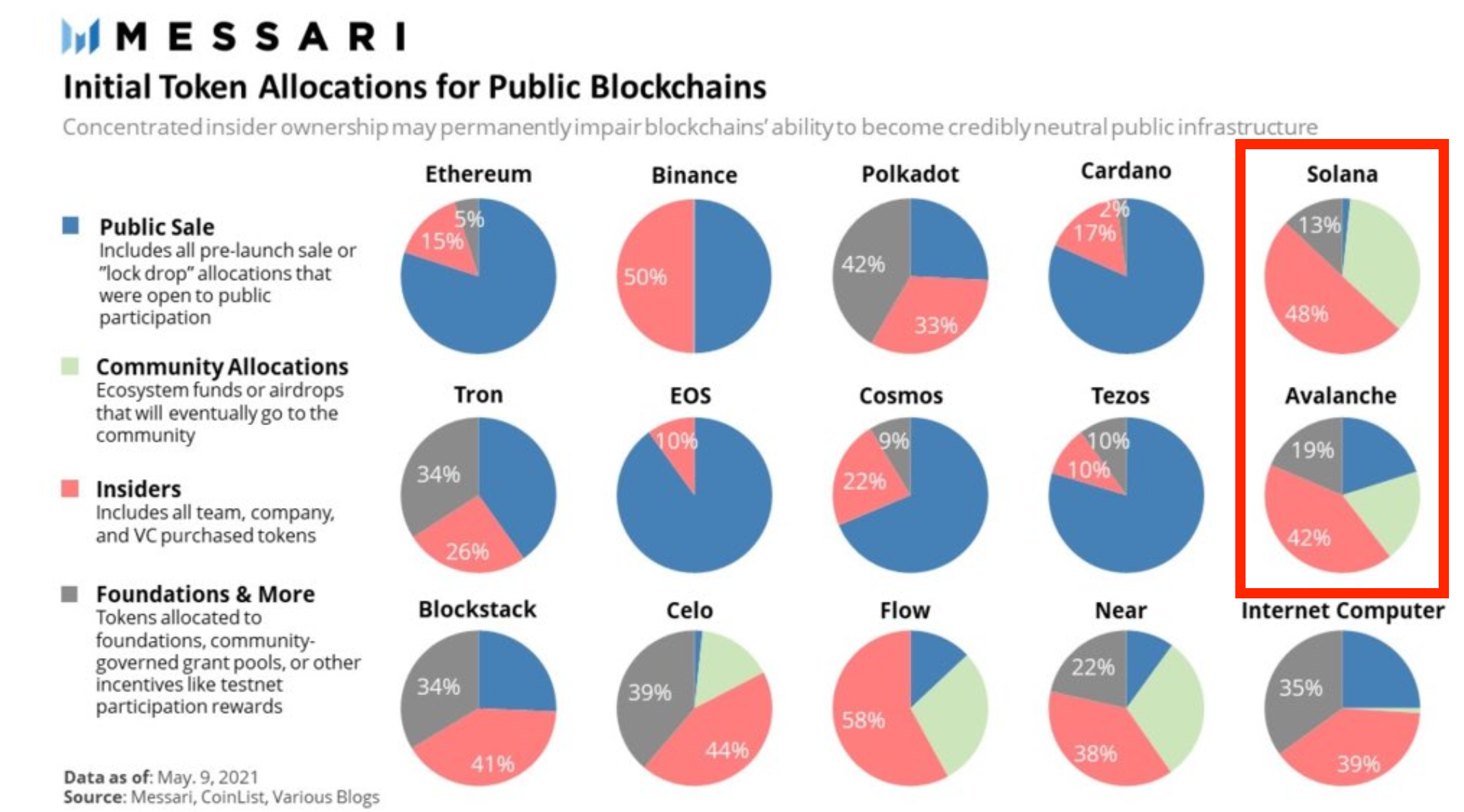 Solana and Avalanche are the most egregious examples of private early rounds of token distribution. Where the Ethereum sale was free and open to the public, without KYC, both Solana and Avalanche have had private rounds where VC funds are able to gain a significant amount of the supply.