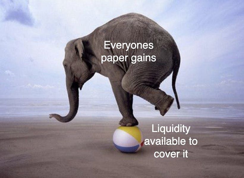 Crypto price movements are violent because there are relatively thin order books supporting everyone’s unrealized gains. Especially when it comes time for leverage liquidations, liquidity leaves markets, and forced-sellers sell into terrible offers that they must take.