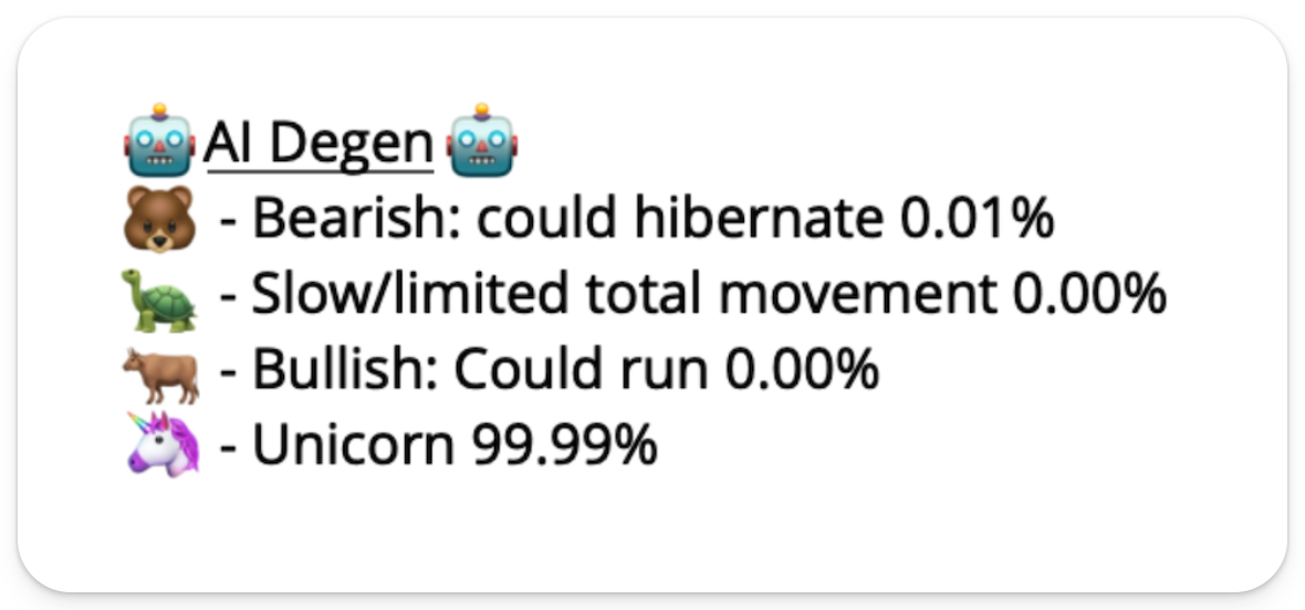 Its SeerBot uses a Time Series AI to filter for tokens matching with historically performant tokens on a number of quantitative and qualitative factors, cutting down research time for traders. The bot digs into the onchain history and ships ratings based on metrics like percent of LP locked, 24-hour volume, memeability, and holder distribution. Once the bot makes this analysis, it will assign the token an emoji-coded score with the percentage likelihood that the token will fall into each bucket.