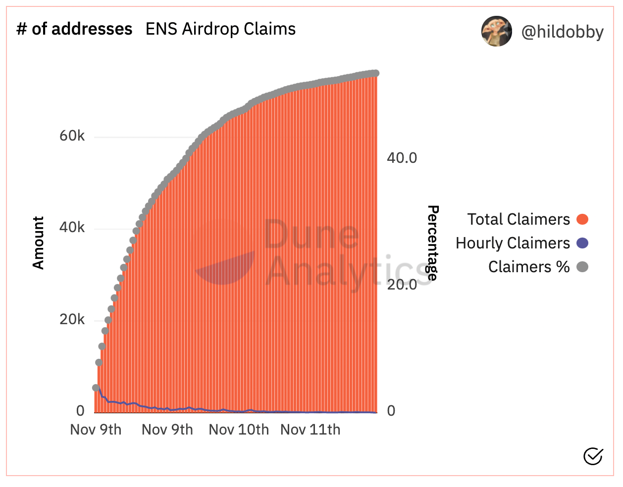 - It had a 57% claim rate in just a few short days with nearly 75k addresses claiming close to 15M tokens—nearly 140k total address recipients