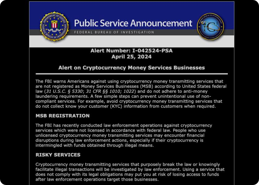 Everything happens at once, it seems, with the FBI also issuing a warning, urging Americans only to use crypto services registered as Money Services Businesses under federal law — i.e. No self-custodial services. The government recently seems to have accelerated its war on crypto and privacy overall to the extent that even courts have called their behavior in crypto cases a “gross abuse of power.”